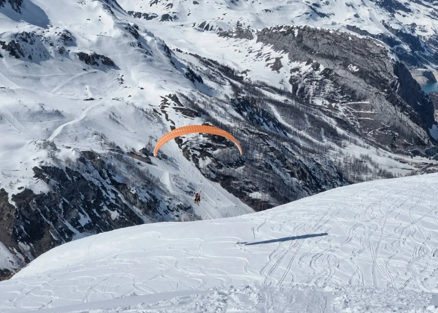 Vuelo en parapente sobre el valle: una experiencia inolvidable que te permitirá ver los Alpes desde el aire, flotando sobre un paisaje blanco infinito.