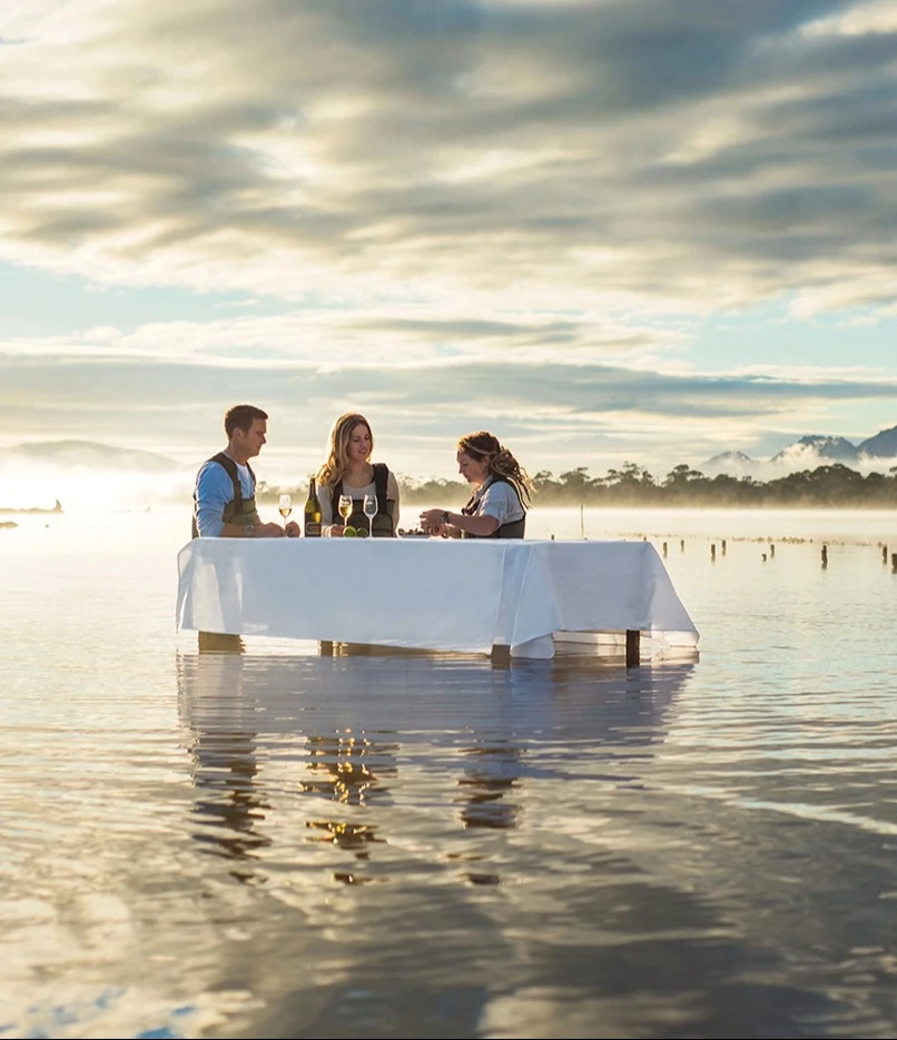 En la isla de Tasmania, te esperará una granja de ostras donde podrás recolectarlas tú mismo con botas de pesca, mientras una mesa con vino espumante y vajilla perfecta te aguarda sobre el agua al atardecer.