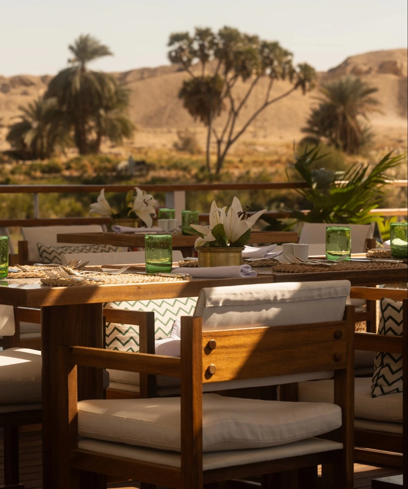 Cada dahabiya tiene su propio estilo. Algunas evocan la elegancia clásica de los antiguos barcos privados que navegaban el Nilo, con interiores cálidos, maderas nobles y textiles tradicionales. Otras reinterpretan este tipo de navegación con una estética más contemporánea, donde el diseño apuesta por espacios luminosos, materiales naturales y una conexión constante con el exterior.