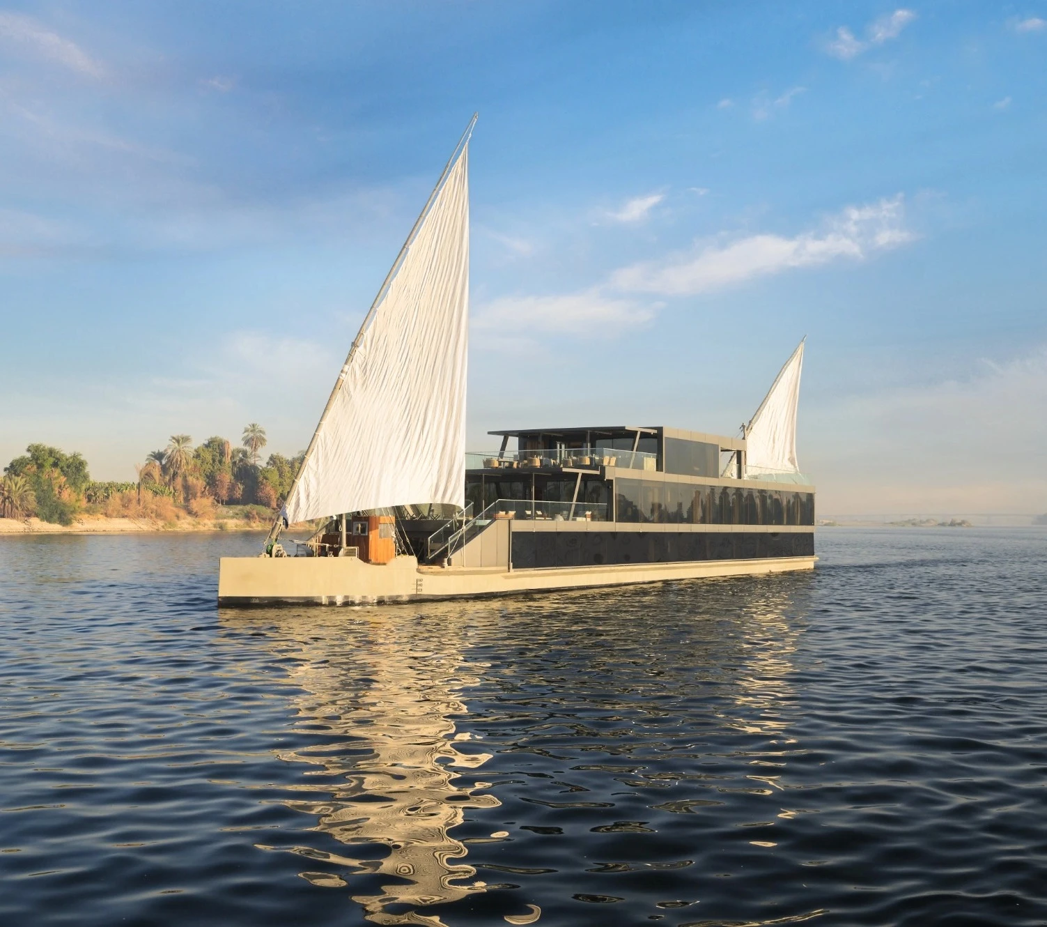 Una interpretación contemporánea del Nilo: Aquí el diseño apuesta por líneas limpias, materiales naturales y una sensación de amplitud constante. La luz entra por grandes ventanales y la cubierta se convierte en el lugar perfecto para observar el paisaje mientras el barco avanza lentamente entre palmerales y templos.