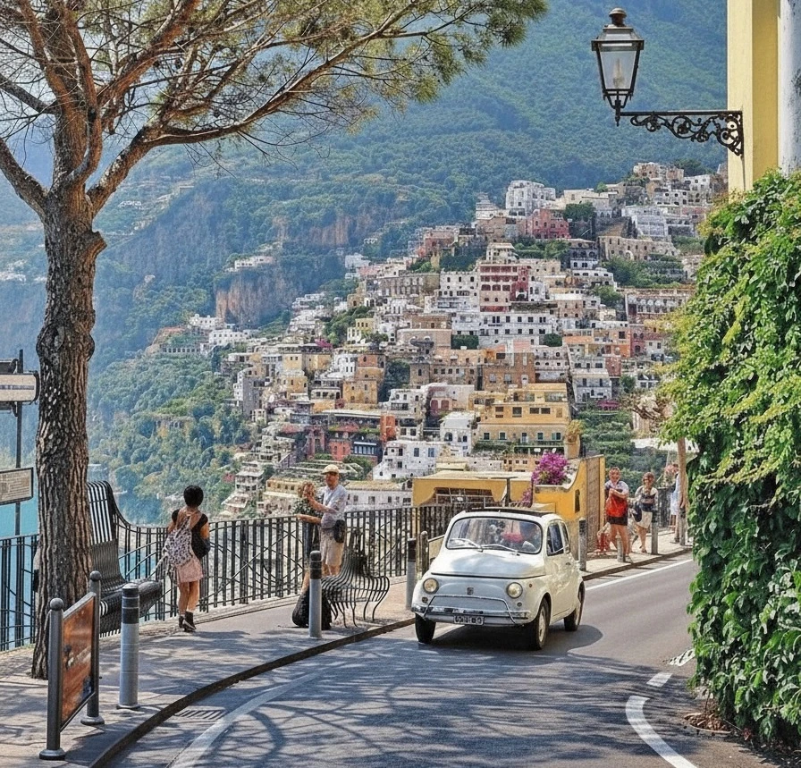 Paseo en coche clásico por la Costa Amalfitana, con paradas en pueblos suspendidos sobre el mar y la opción de viajar acompañado por un fotógrafo que documente la experiencia.