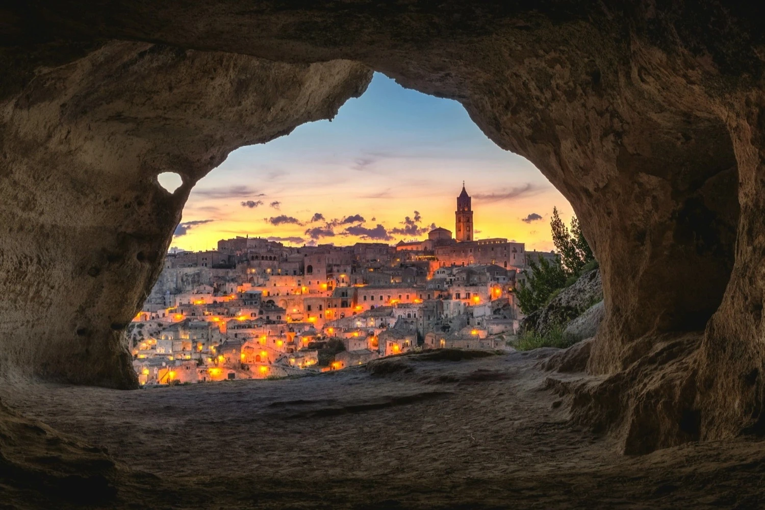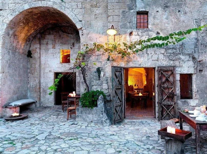 Caminatas por Matera, con la posibilidad de dormir en alojamientos excavados en la roca y cenar en terrazas privadas frente a los desfiladeros iluminados.