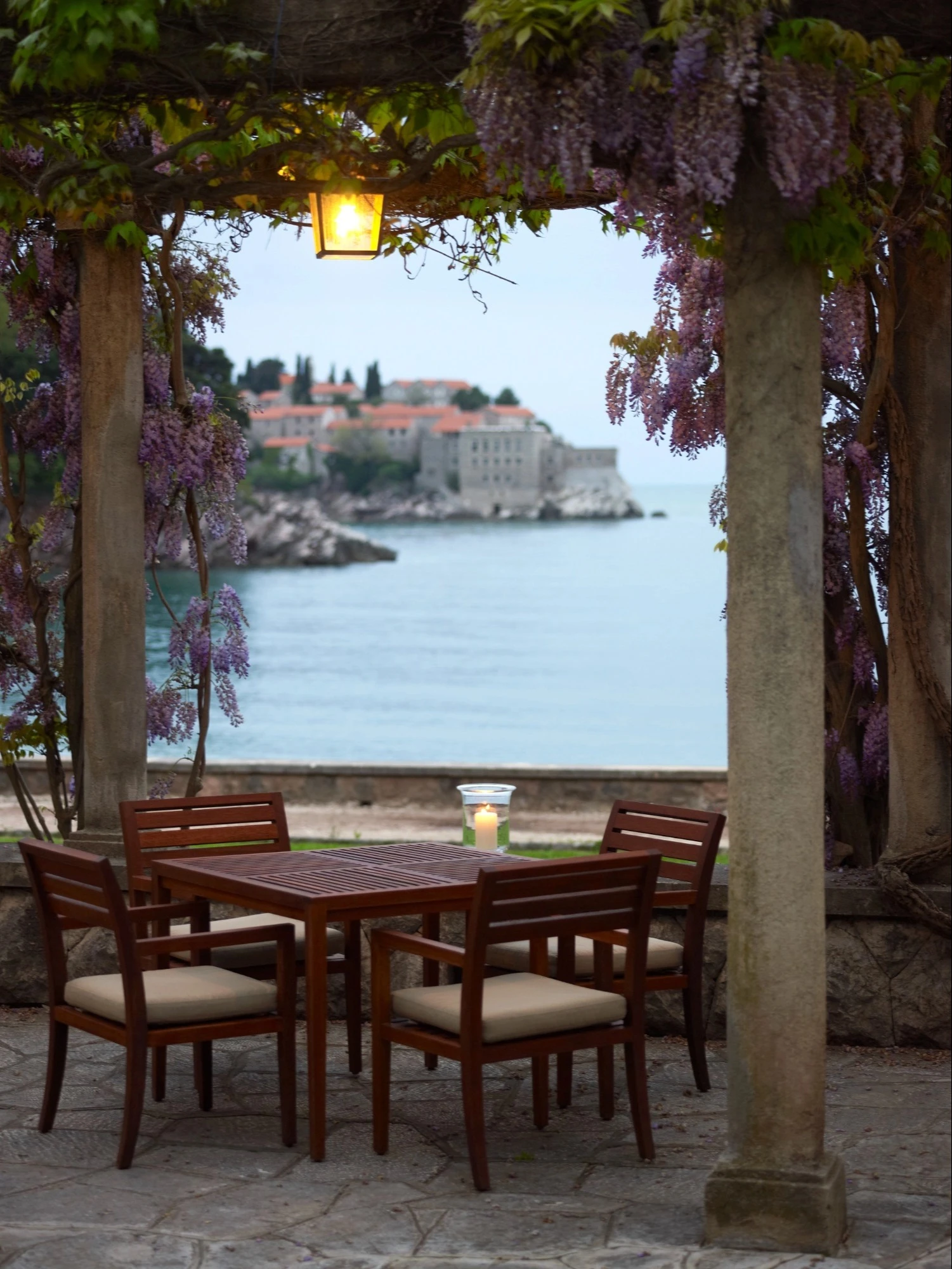 Más allá de la bahía, la estancia frente al mar se sitúa en la costa de Sveti Stefan. El antiguo pueblo fortificado sobre un islote unido a tierra firme por un estrecho istmo crea uno de los paisajes más reconocibles del Adriático. Playas tranquilas, aguas transparentes y terrazas abiertas al horizonte permiten bajar el ritmo y combinar descanso con salidas en barco por la costa.