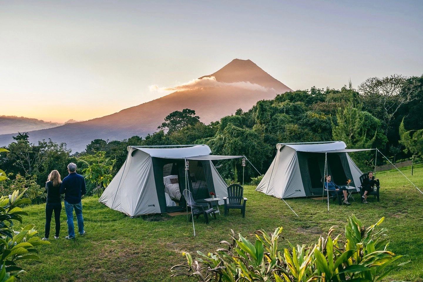 Trekking y glamping privado en volcán activo: ascenso a pie hasta un volcán con noche en tiendas montadas solo para ti, sin otros viajeros, con recogida al amanecer en helicóptero.